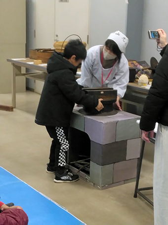 鉄鍋をカマド(に見立てたもの)に移すようす。