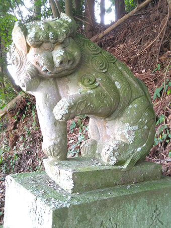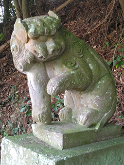 遠征中、全てのカビを落としている訳ではありませんが、多少なりとも清掃してから写真を撮った方が、あとで後悔しないですね。もちろん緑色のコケの場合は、勝手に落としたりはしません。コケに包まれた狛犬の表情を楽しみます。この狛犬は、ちょこんと左前足を上げているのが良いですね。