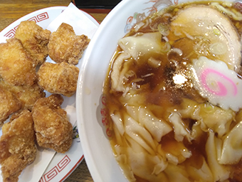今日の1人反省会、かづ〇食堂のワンタンメンと鳥の唐揚げ。