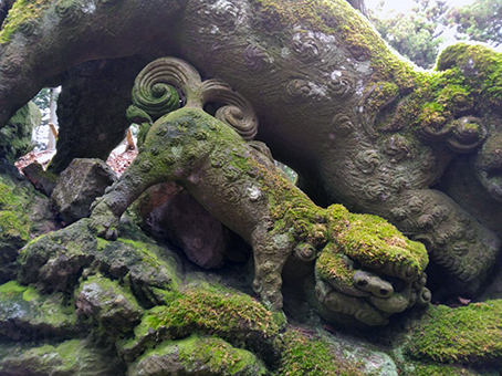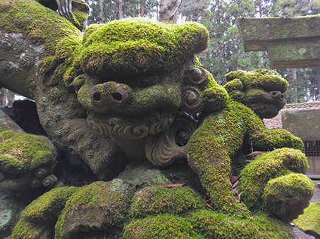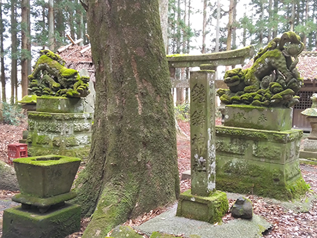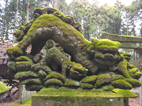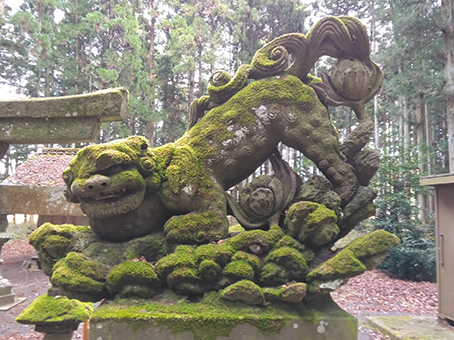 いやー、来た甲斐がありました。苔むして最高の狛犬です。飛翔狛犬といわれる一連の狛犬の中でも、この狛犬のように後ろ脚が真っ直ぐに伸びていないほうが、個人的には力強さも感じられ好きですね。神社境内の雰囲気も良いし…至福の時を味わえました。…お腹も空いてきたし、お昼はどうしましょうかね?